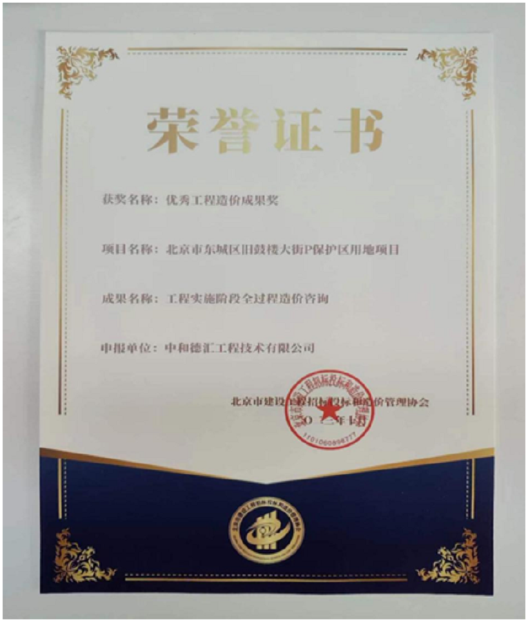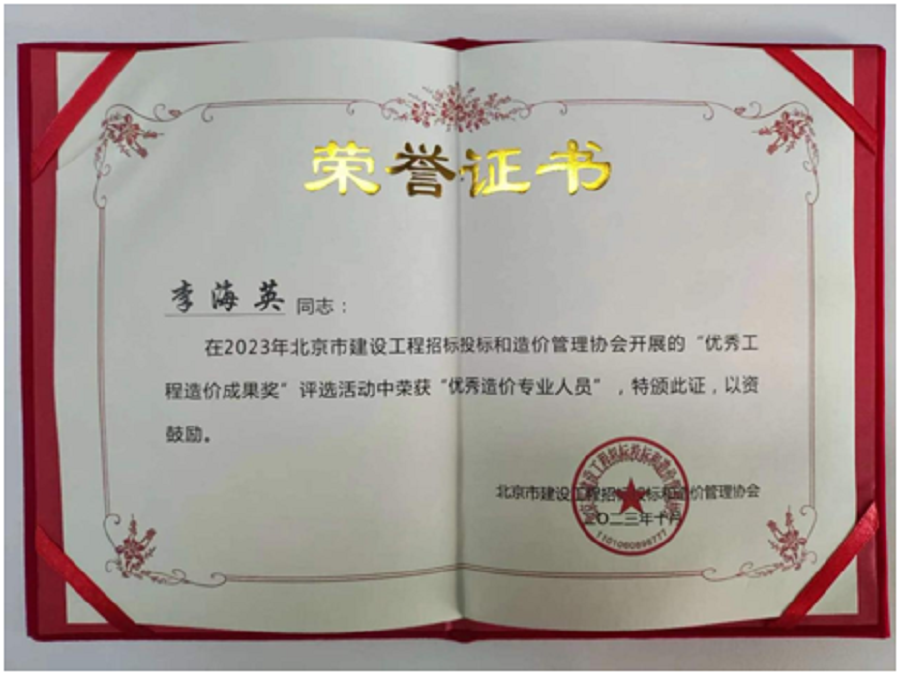 2023年10月在北京市建設工程招標投標和造價管理協(xié)會開展的2023年度優(yōu)秀成果案例評選過程中,中和德匯工程技術有限公司榮獲優(yōu)秀工程造價成果獎,同時我司造價一部工程師李海英、陳元同志被評為“優(yōu)秀造價專業(yè)人員”。