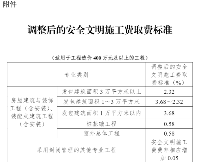 一、工程造價(jià)400萬(wàn)元及以上的房屋建筑與裝飾工程(含安裝)、裝配式建筑工程(含安裝)以及采用封閉管理的其他工程,其安全文明施工費(fèi)費(fèi)率相應(yīng)增加0.05-0.1%。調(diào)整后的安全文明施工費(fèi)取費(fèi)標(biāo)準(zhǔn)詳見(jiàn)附件。