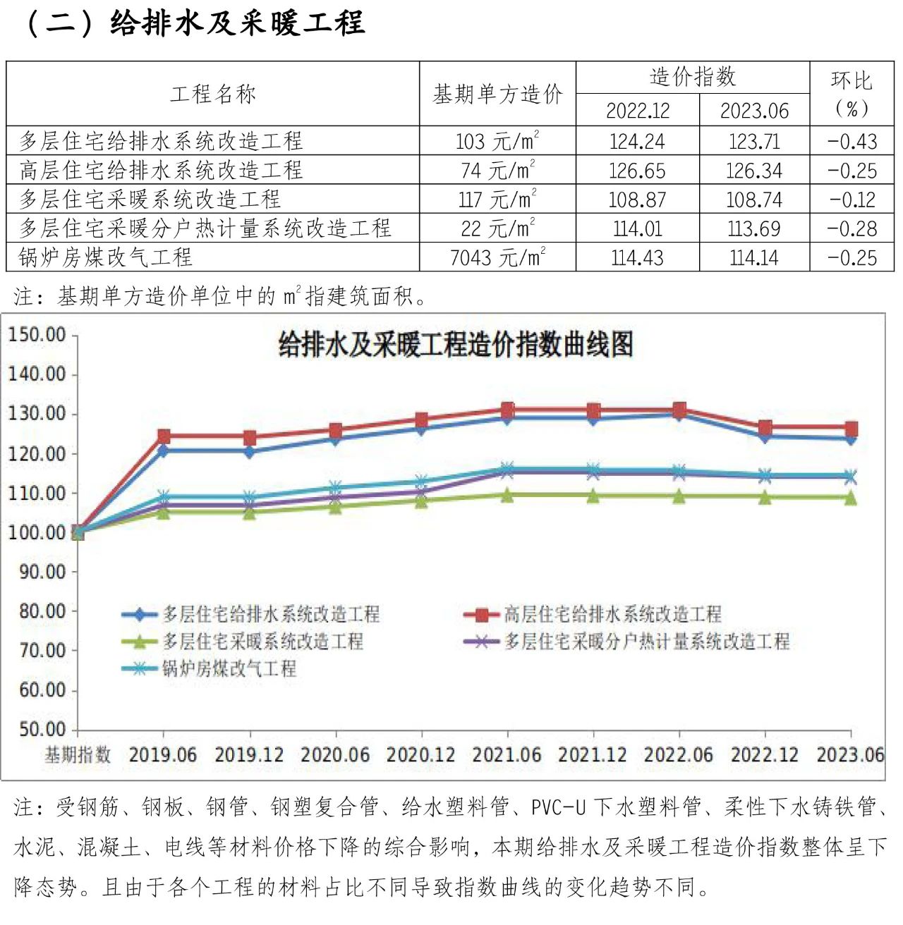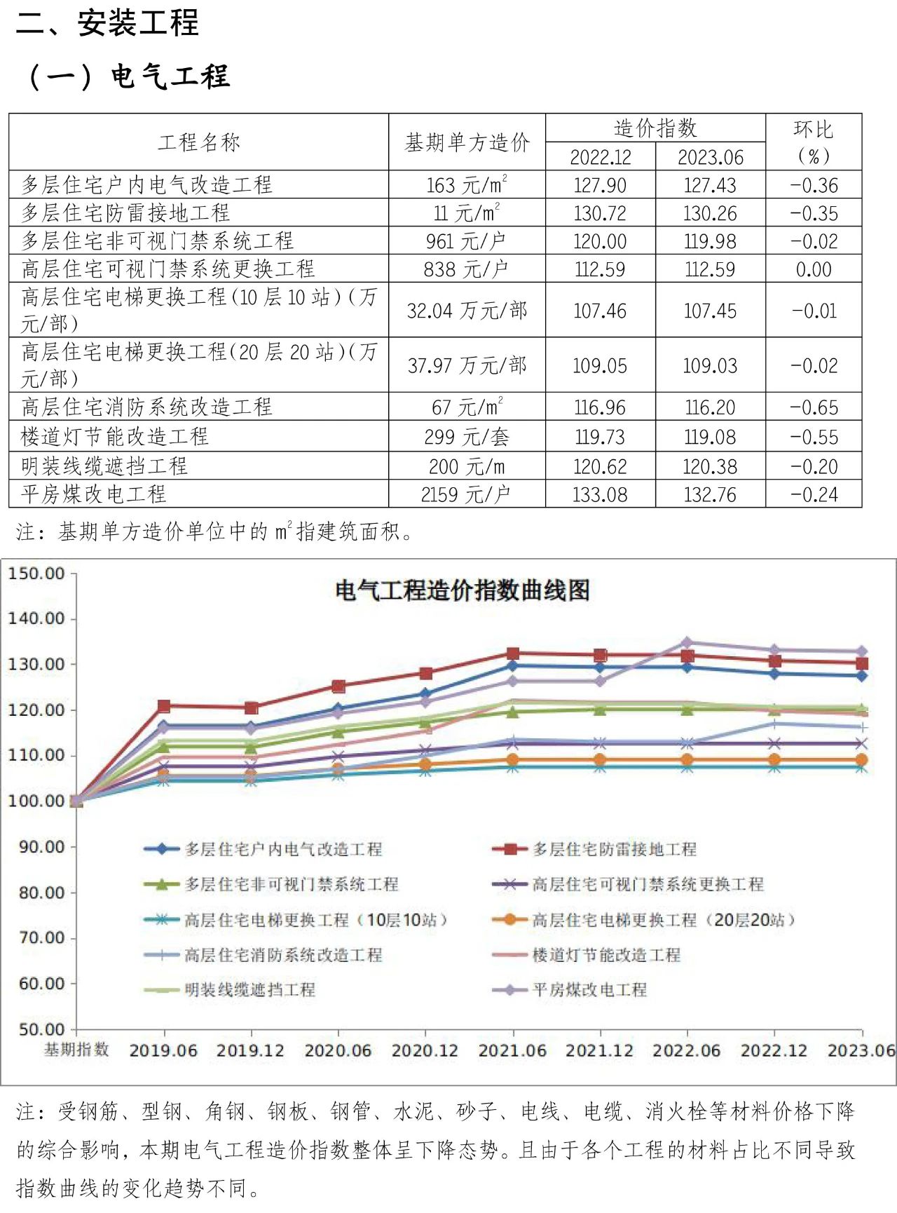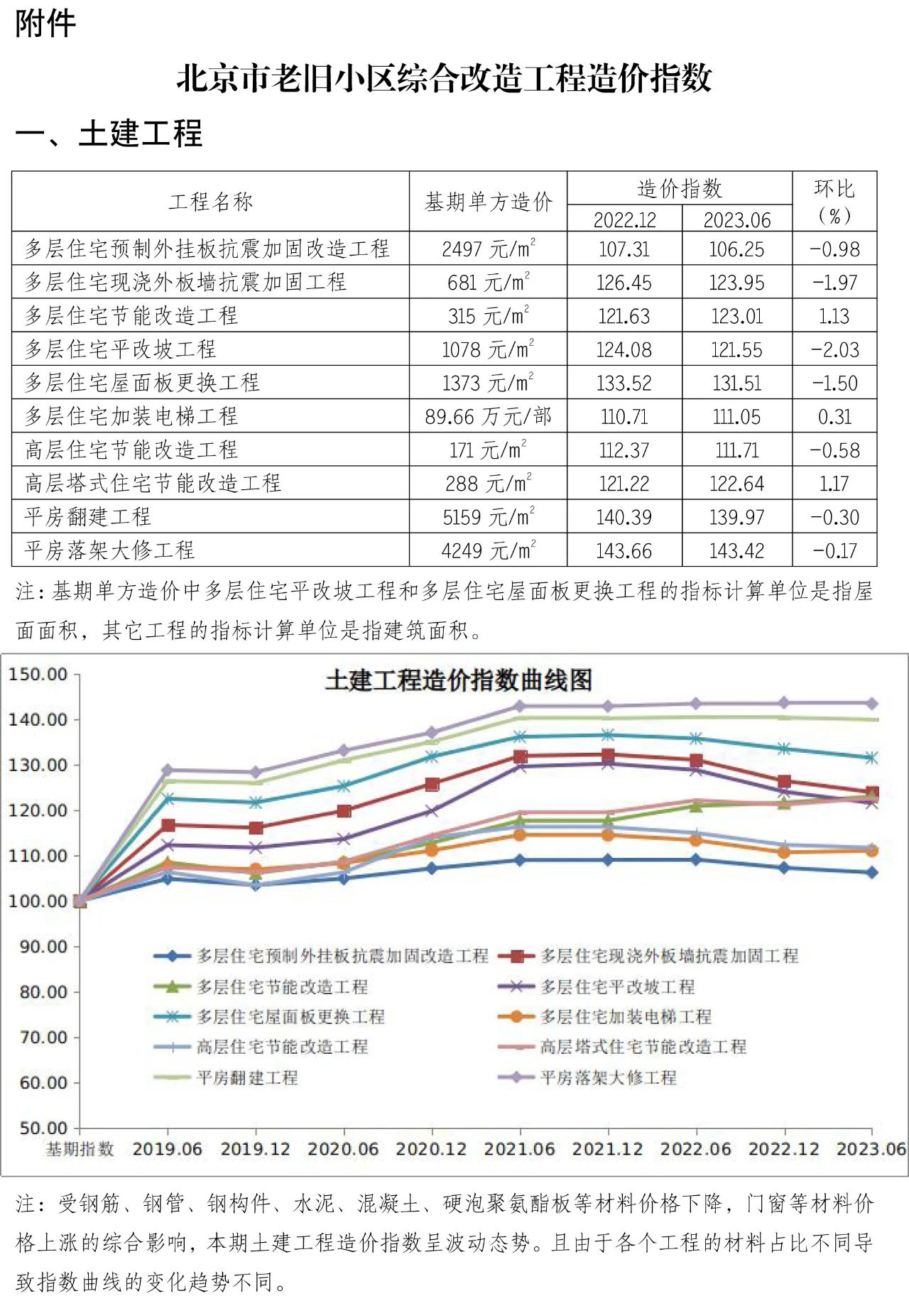 為貫徹落實《關于全面推進城鎮(zhèn)老舊小區(qū)改造工作的指導意見》(國辦發(fā)〔2020〕23號)要求,加強對老舊小區(qū)整治工程造價的動態(tài)指導,為合理確定和有效控制工程造價提供參考,現(xiàn)發(fā)布第十二期北京市老舊小區(qū)綜合改造工程造價指數(shù)。本指數(shù)在《北京市老舊小區(qū)綜合改造技術經(jīng)濟指標》(2017)的基礎上進行測算,以2016年9月為基期,2017年12月為第一期,之后每半年發(fā)布一次。2016年9月的基期造價指數(shù)為100,本期人工、材料、機械等價格按2023年6月的《北京工程造價信息》(房屋修繕工程)確定,未包括的材料價格參照同期市場價。