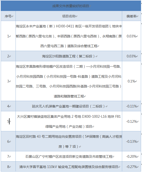 抽查中成果文件質(zhì)量較好、偏差較小的典型項目詳見下表: