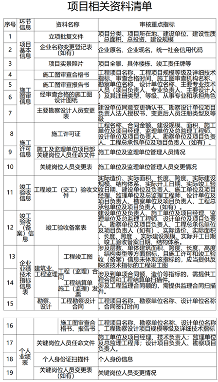 3.房建市政類工程項目應(yīng)當(dāng)結(jié)合該項目在監(jiān)管過程中產(chǎn)生的工程檔案信息,如項目立項、招投標(biāo)、施工圖審查、施工許可、竣工驗收備案等信息,以及工程項目共享信息進行審核確認(rèn)。