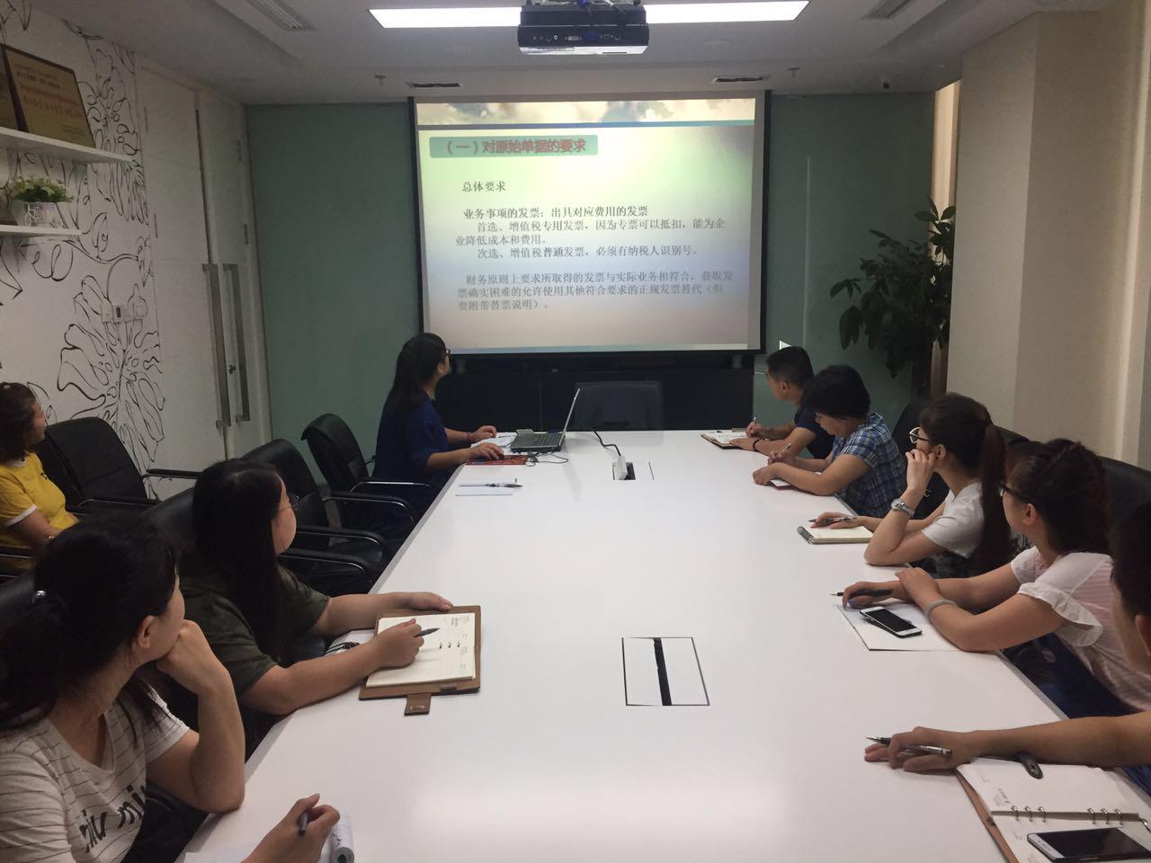 自7月1日,國家稅務總局關于發(fā)票的新規(guī)出臺以后,公司財務部按照新規(guī)的精神對內(nèi)部費用報銷進行了規(guī)范,新規(guī)實施兩個月以來,財務部們針對各部門在費用報銷中存在的問題進行梳理,對開票過程中存在的疑問進行匯總整理,形成規(guī)范的培訓文檔,并對各部門相關人員進行了系統(tǒng)的培訓。參會人員認真學習,針對有疑惑的地方及時提問,培訓人員對各種問題認真解答。收到良好的培訓效果。