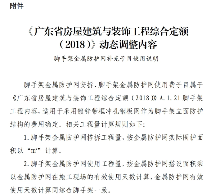 為進一步提升我省建設工程項目的安全綠色施工管理水平,經(jīng)測算,補充《廣東省房屋建筑與裝飾工程綜合定額(2018)》腳手架金屬防護網(wǎng)相關定額子目,現(xiàn)印發(fā)你們,請遵照執(zhí)行。