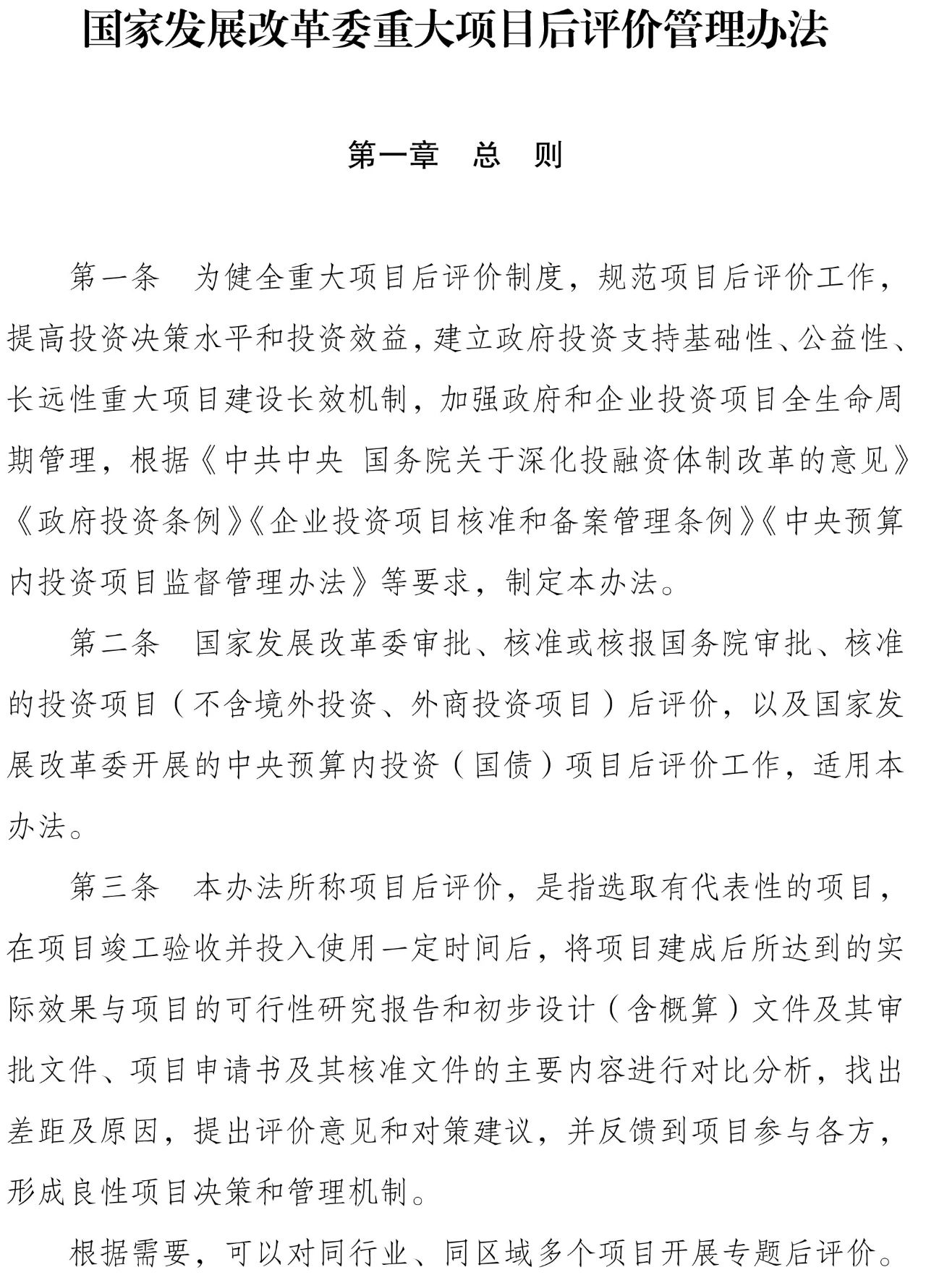 為健全重大項(xiàng)目后評(píng)價(jià)制度,規(guī)范項(xiàng)目后評(píng)價(jià)工作,提高投資決策水平和投資效益,建立政府投資支持基礎(chǔ)性、公益性、長遠(yuǎn)性重大項(xiàng)目建設(shè)長效機(jī)制,加強(qiáng)政府和企業(yè)投資項(xiàng)目全生命周期管理,我們研究制定了《國家發(fā)展改革委重大項(xiàng)目后評(píng)價(jià)管理辦法》。現(xiàn)印發(fā)給你們,請按照執(zhí)行。
