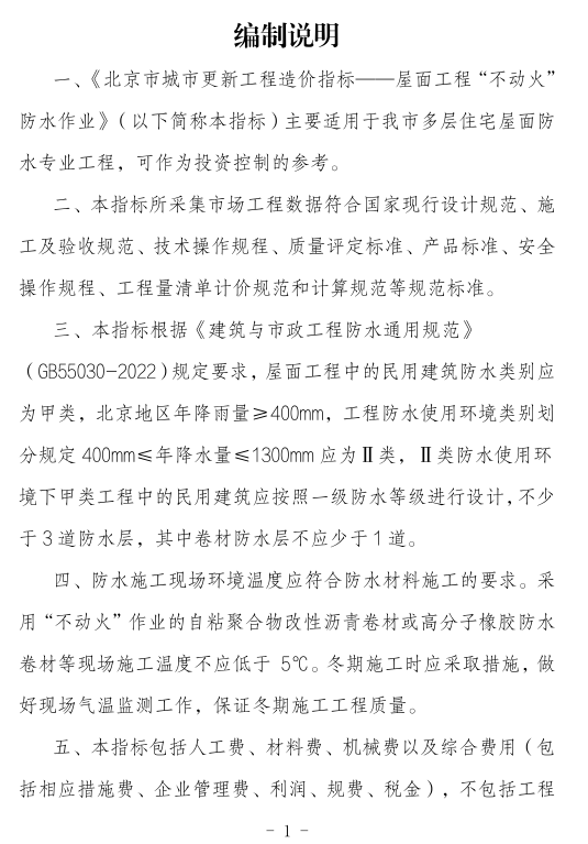北京市住房和城鄉(xiāng)建設(shè)委員會(huì)發(fā)布《北京市城市更新工程造價(jià)指標(biāo)——屋面工程“不動(dòng)火”防水作業(yè)》