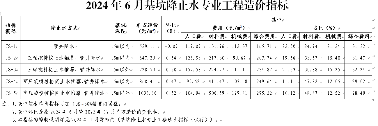 北京市住房和城鄉(xiāng)建設(shè)委員會(huì)發(fā)布《2024年6月基坑與邊坡支護(hù)專業(yè)工程、基坑降止水專業(yè)工程造價(jià)指標(biāo)》
