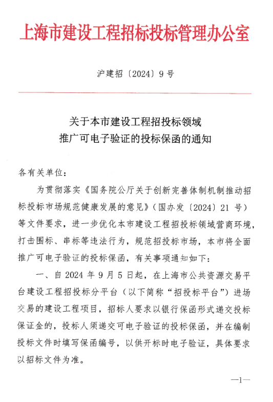 為進(jìn)一步優(yōu)化本市建設(shè)工程招投標(biāo)領(lǐng)域營商環(huán)境,打擊圍標(biāo)、串標(biāo)等違法行為,規(guī)范建設(shè)工程招投標(biāo)市場,2024年8月30日,上海市建設(shè)工程招標(biāo)投標(biāo)管理辦公室印發(fā)了《關(guān)于本市建設(shè)工程招投標(biāo)領(lǐng)域推廣可電子驗證的投標(biāo)保函的通知》(滬建招 〔2024〕9號),就推行可電子驗證的投標(biāo)保函的時間、投標(biāo)保函銀行名錄、投標(biāo)保證金評標(biāo)委員會評審依據(jù)等事宜做出相關(guān)要求(詳見文末附件)。