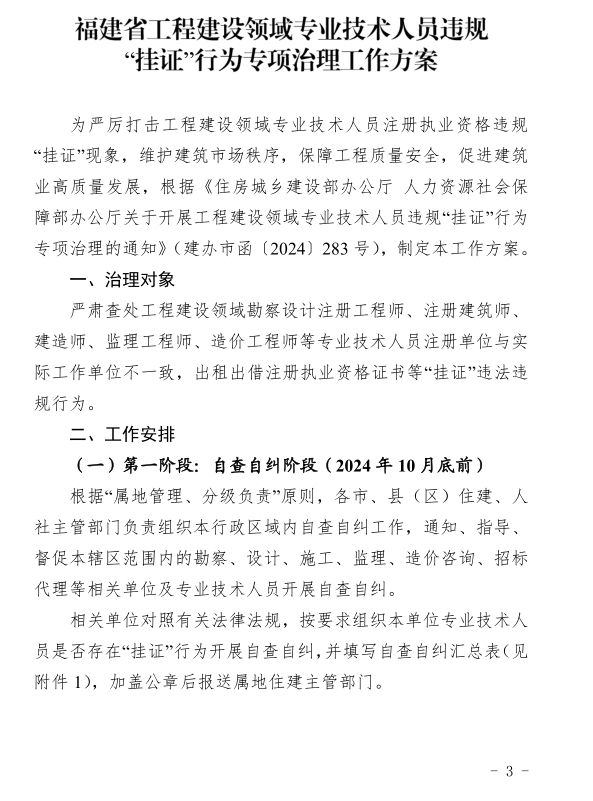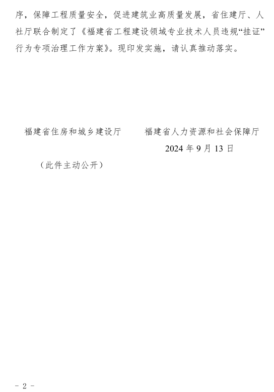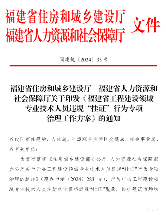 福建省住房和城鄉(xiāng)建設(shè)廳、省人力資源和社會保障廳聯(lián)合發(fā)布關(guān)于印發(fā)《福建省工程建設(shè)領(lǐng)域?qū)I(yè)技術(shù)人員違規(guī)“掛證”行為專項治理工作方案》的通知