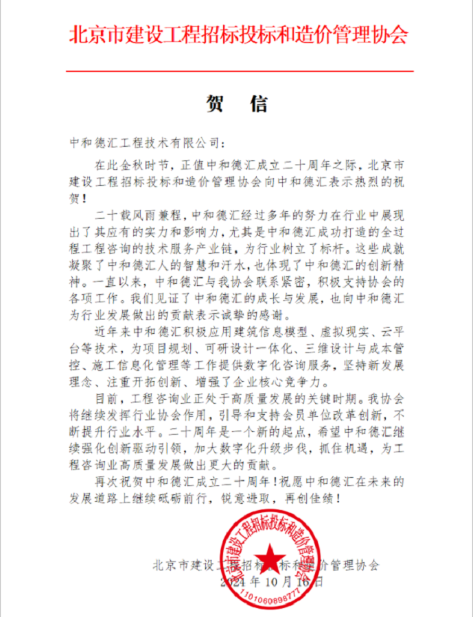 2024年10月16日,正值中和德匯成立20周年之際,公司又收到了北京市建設(shè)工程招標(biāo)投標(biāo)和造價(jià)管理協(xié)會(huì)的熱烈祝賀。這封賀信不僅是對(duì)我們過(guò)去20年辛勤付出和卓越成就的肯定,更是對(duì)我們未來(lái)發(fā)展提出了更高的期望。我們將全力以赴在京標(biāo)價(jià)協(xié)工作指導(dǎo)下,積極參與行業(yè)合作,提升技術(shù)創(chuàng)新能力,為業(yè)主提供更加優(yōu)質(zhì)的服務(wù),共同為推動(dòng)工程咨詢行業(yè)的健康發(fā)展貢獻(xiàn)力量。